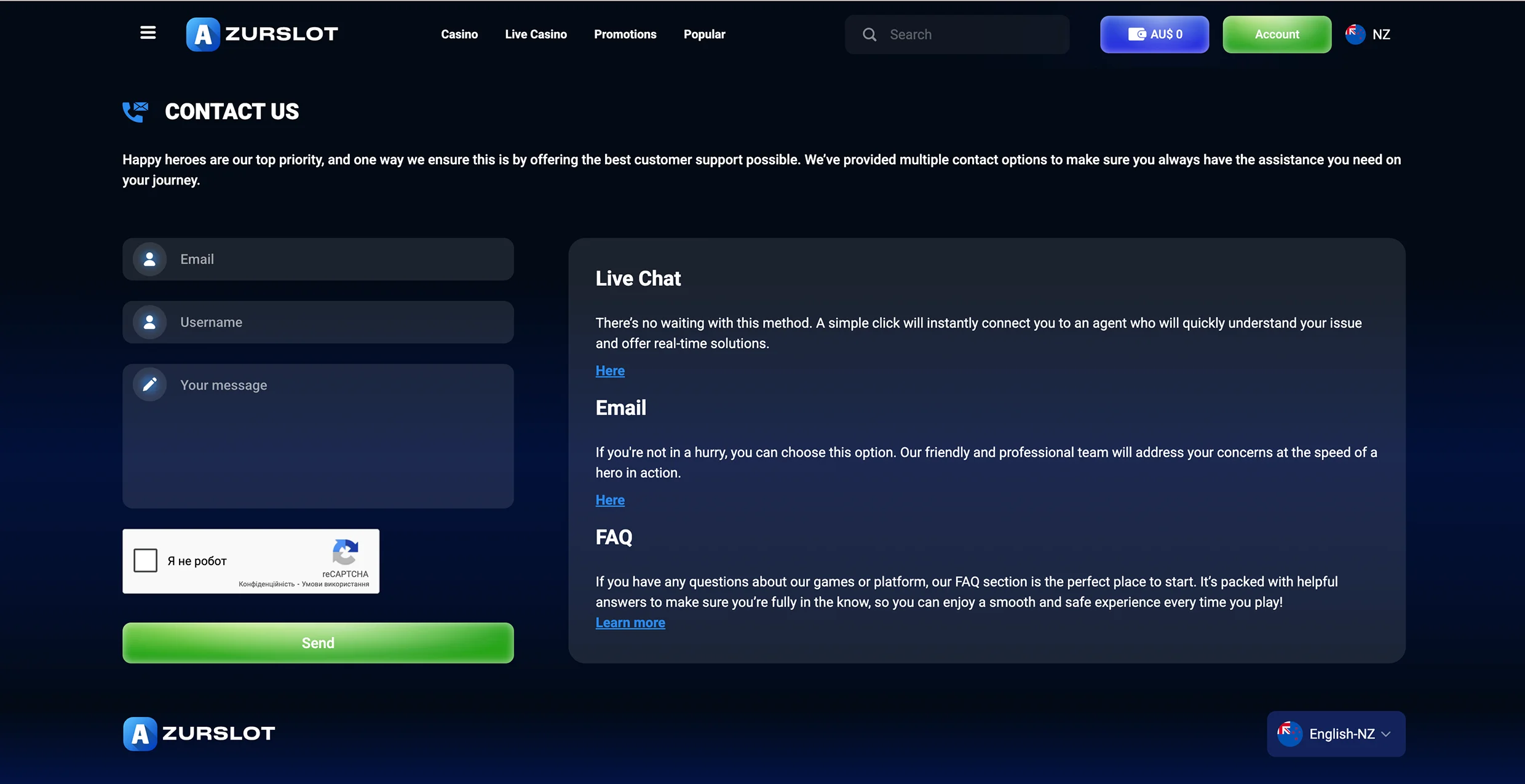 AzurSlot has a responsive customer support team available 24/7 to assist you. Although there’s no phone line assistance available, you can get help via email or chat support.