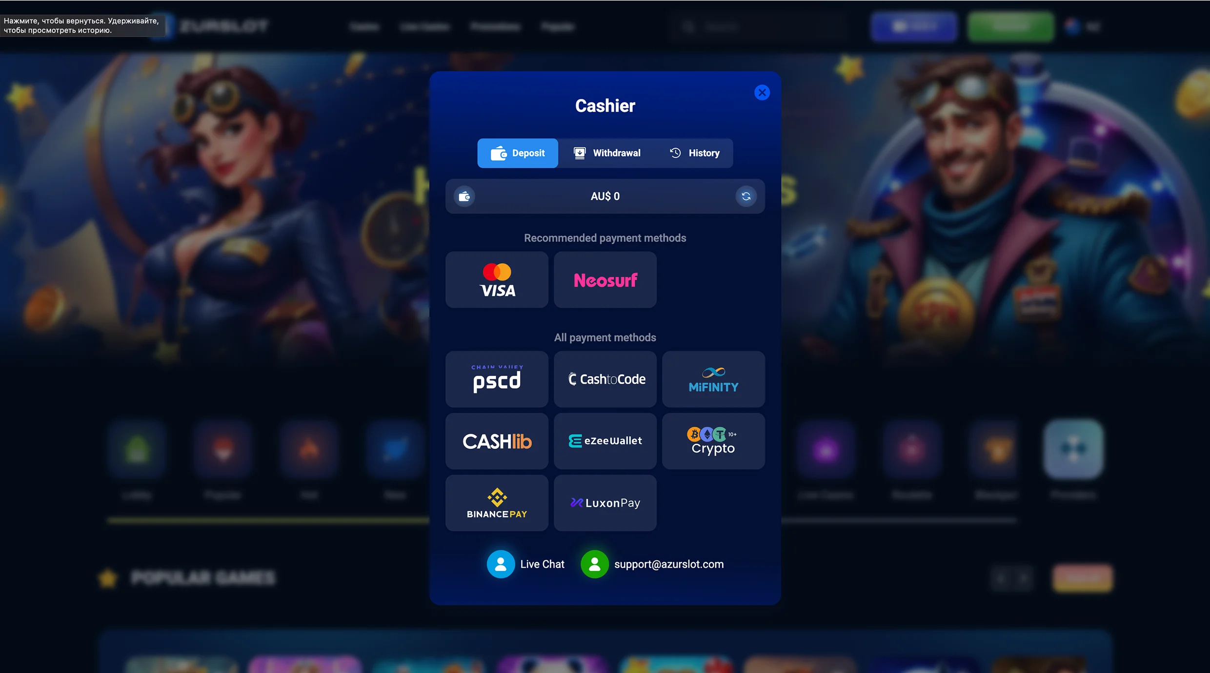 Choose from a wide range of deposit methods on AzurSlot New Zealand: